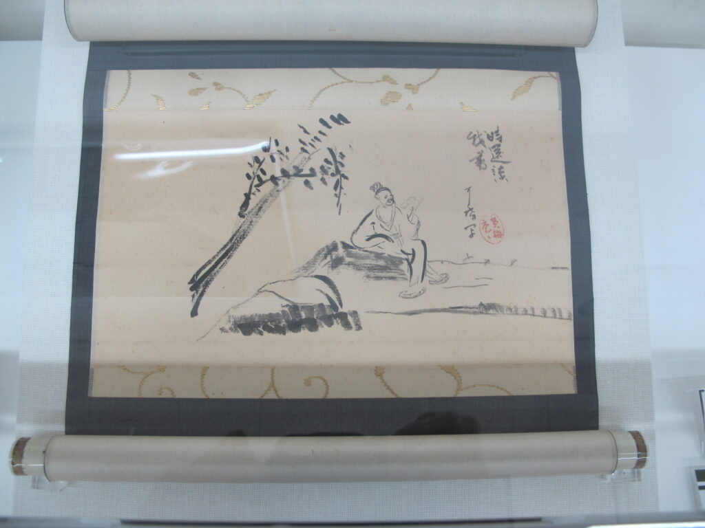 今回の展示で、大休老師が松永に送った漢詩(古徳偈 応需一洲翁=ことくげ おうじゅいっしゅうおう)があります。この漢詩が書かれたのは昭和16年です。松永は戦前に電力事業の第一線を退き柳瀬山荘にこもって茶道三昧の生活を送りました。「(禅僧の)つつましい生活には少々の水と空を流れる雲さえあれば充分である」という意味が込められた漢詩は、柳瀬山荘での隠遁時代の心構えを示すために大休老師が選んだのでしょう。松永は平林寺を菩提寺とし、山門の脇間に安置されている金剛力士像などを寄進、寺の隣地には田舎家(現在の睡足軒(すいそくけん))を建てました。